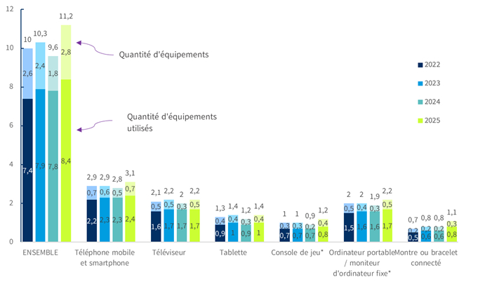 - Champ : ensemble de la population de 12 ans et plus disposant d’une connexion fixe à internet à domicile, en nombre d’équipements - effectif total pondéré n : 3 256 –